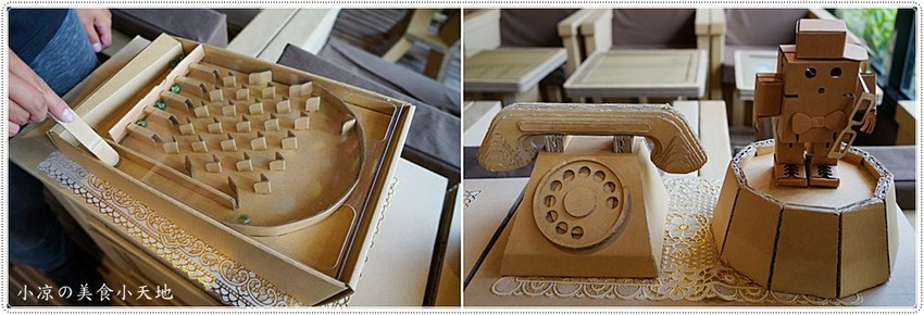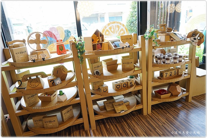 陳列物品的架子都是瓦楞紙去弄出來的,依序的擺放很有條理