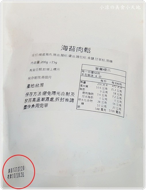每一肉乾、肉鬆、魷魚絲等全部品項、在包裝後方都會貼上品名、成分、營養標示、有效期限