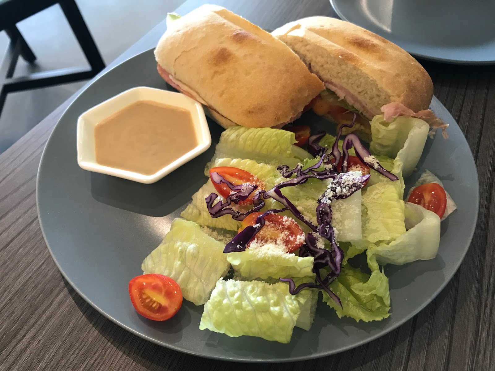 我們點了一份燻雞起司巧巴達當作下午茶點心,份量還不小,兩個人分著吃剛好!生菜的鮮脆度非常棒,淋上日式胡麻醬汁,非常清爽美味!