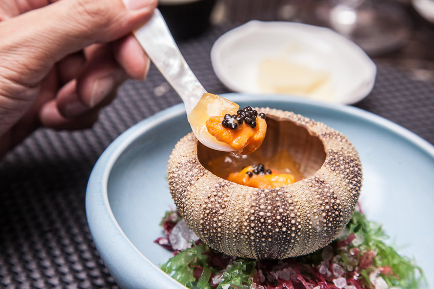 整顆海膽殼上桌噱頭十足,裡面是海膽、胭脂蝦、特製的海鮮凍,上面綴上頂級的鱘龍魚子