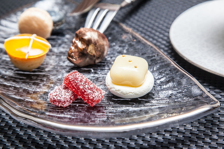 眾多甜點中最酷的就是這顆骷顱頭造型的巧克力,有著酸甜苦辣四種口感,咬咬心裡在想怎麼可能有這樣的甜點,管家說這要一口吃才有酸甜苦辣的感受,咬咬半信半疑地一口吃下,真的是酸甜苦辣的口感,而且是漸層的出現,超厲害!