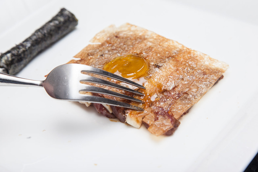 吃的時候可以將脆皮切成脆面狀,混著鵪鶉蛋當作醬汁