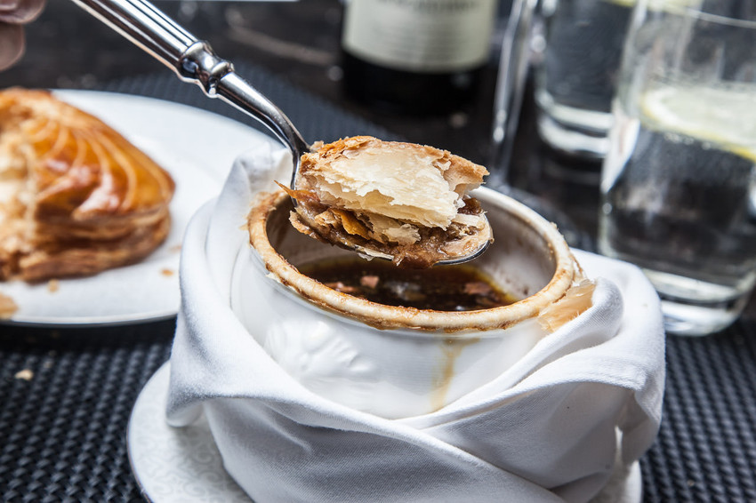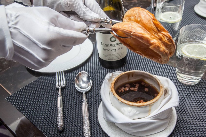 博古斯的代表作”黑松露酥皮湯”,為1974年,他特別為當時的總統季斯卡所創作的,用特別設計製作的酒杯狀湯盅,盛著法國著名的黑松露鴨肝濃湯,再覆蓋上一層奶酪酥皮,烤成一朵如香菇狀的可愛造型