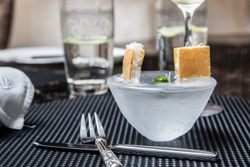 DE LOIN德朗餐廳這次推出的餐廳週套餐主打簡約呈現食材的本位為主,融入日式料理的技法及法式料理的精緻為一身,像這道銀芽透抽搭配佐青醬就非常特別,而且這器皿也太厲害了,不說咬咬還以為是放在冰塊上呢