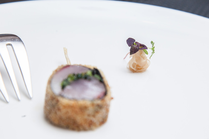 吃的時候將鮮魚連同高粱醋醃薑絲一起入口,鮮魚裡加了雪裡紅與少許的柚子胡椒提味,讓除了鮮魚的甘美味還增添了柚子胡椒清爽的風味,高粱醋醃薑絲適時的提供酸甜氣息,口感清爽芳香!