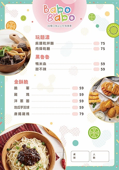Babo8abo叭噗8噗不只是玩珍珠玩飲品,還有提供麵類、炸物、點心做選擇唷!