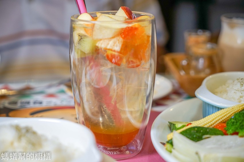 綜合水果氣泡水(單點$150)。攪拌均勻後,水果搭配最近超紅的氣泡水,跟汽水一樣的口感搭配水果風味,讓人覺得清爽。