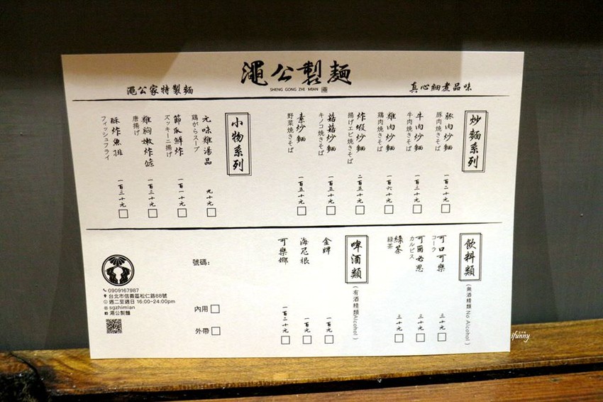 這是的澠公製麵菜單,他們並不是拉麵店,雖然裝潢也很符合拉麵的調性。主要提供炒麵、炸物、飲料及啤酒類,價格也頗為親民。