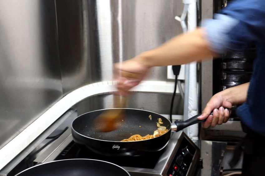 澠公製麵的麵條是採用台灣的油麵喔!獨家特製的醬汁加了美乃茲、中濃醋、清酒等調製而成,將麵條炒得醬香十足。