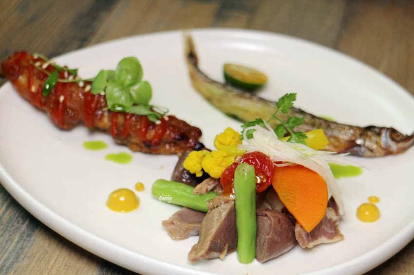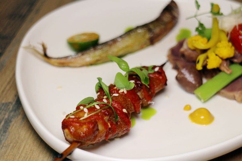 大家吃麵攤時都會點黑白切來吃吧!雞胗、雞心、肝連都吃過吧!主廚蔡斌翰採西式手法,油封雞心、雞胗、肝連並配以薑絲,這幾乎是台灣人很熟悉的食材,再配上咖哩白花椰、胡蘿蔔、蕃茄、四季豆,以涼拌沙拉的方式再佐上芥末子醬。一點都不違和的呈現,入口後既熟悉又帶著新鮮滋味,簡單卻不平凡啊!