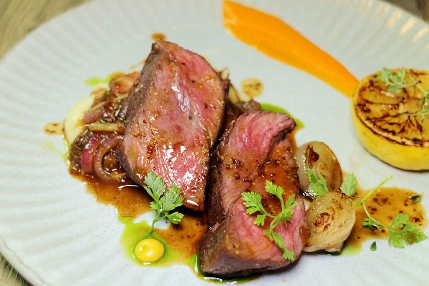 採用紐西蘭牛菲力,直火烤出粉嫩的色澤。搭配烤檸檬、蜂蜜胡蘿蔔泥、芥末籽肉汁及英式芥末。底下襯以軟化的紫洋蔥及烤過的珍珠洋蔥。建議先切一塊吃原味,恰到好處的熟度,富含肉汁且口感滑嫩細緻。接著將一旁的醬汁混合再淋上檸檬汁,酸甜的滋味經由咀嚼更顯牛肉的風味。