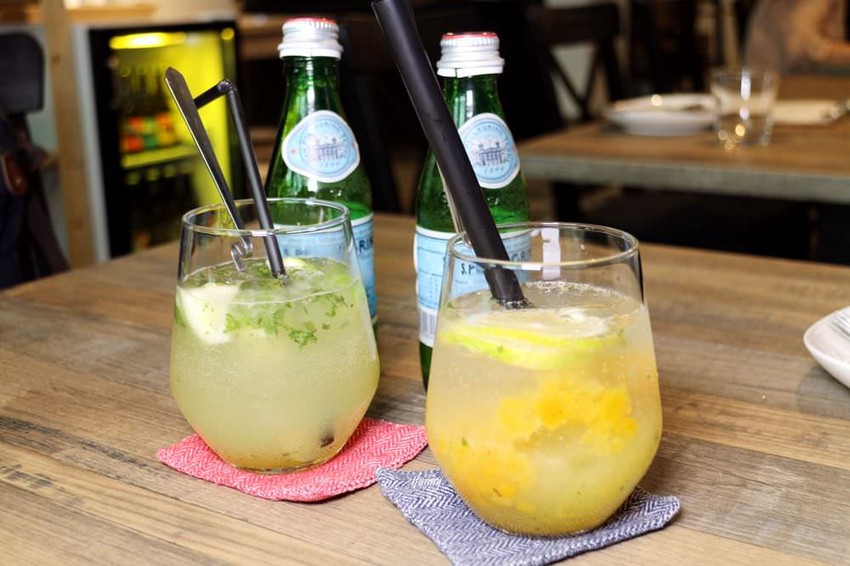 上桌後再把氣泡飲倒入與水果結合,左邊就是摩西多的無酒精版本,清甜帶酸特別適合酷夏來飲用。另外一杯則採用當季的芒果及鳳梨,並能嚐到新鮮果粒。