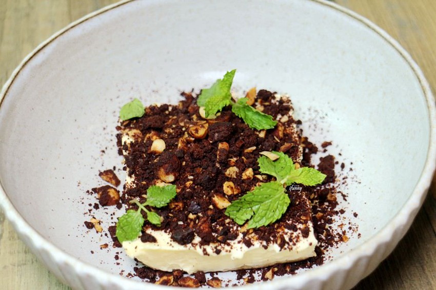 主廚表示他以堅果及巧克力脆片取代可可粉,中間則是正統的馬斯卡朋起司、蛋黃、糖的作法,底層是手指餅乾浸泡咖啡酒。其上的堅果及巧克力脆片帶來的脆口感相當討喜,比例恰當的內餡沒有蛋腥味,香濃滑潤的口感用力一泯就化成口中的馥盈香氣,這真是艾方妮近期吃過最有水準的提拉米蘇了!