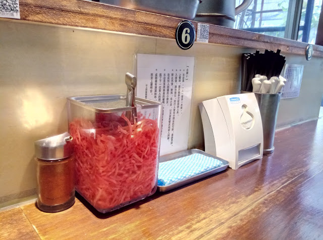 桌上有紅薑、七味粉、抹布、紙巾、筷子、湯匙還有水可以自取。