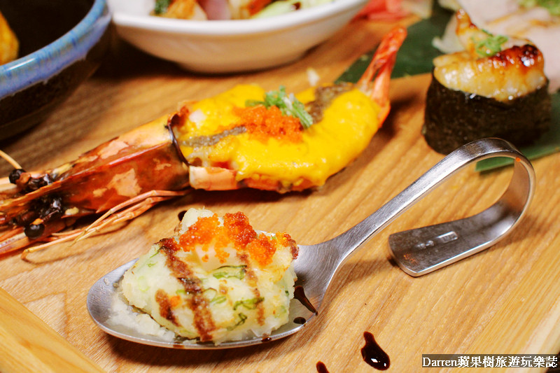 外觀看起來非常厲害的肥蝦蟹膏風味,把草蝦剖背上面是海膽醬和蟹膏加蝦卵,蝦肉鮮美還有濃郁蟹膏風味不錯