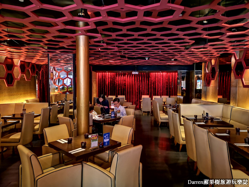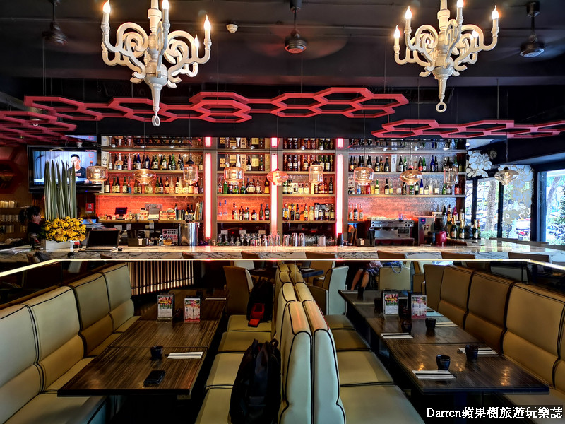 餐酒館裝潢走復古英倫風格路線,最大特色就是利用天花板紅色蜂巢形狀裝飾,來襯托大面積以黑色的主色調