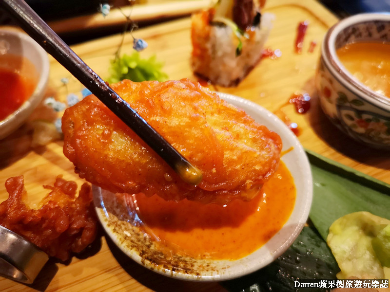 紫蘇蝦球,彈牙的蝦仁包紫蘇葉,可以沾天婦羅醬一起吃,口感上有蝦肉的Q彈甜度以及酥脆芳香的紫蘇