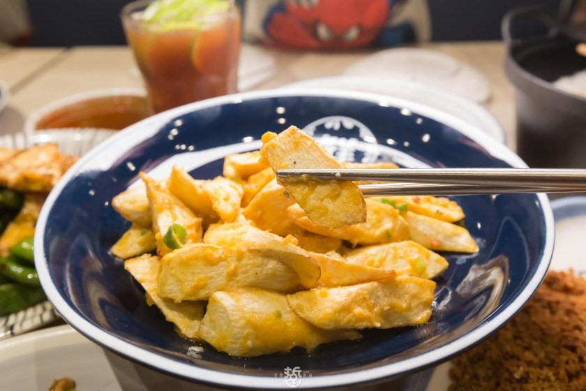 茭白筍加上鹹蛋黃拌炒,是開飯獨創的菜色,沒有任何鹽巴調味,靠的是鹹蛋黃的鹹調味,比鹹蛋苦瓜更甘甜爽口,很下飯。