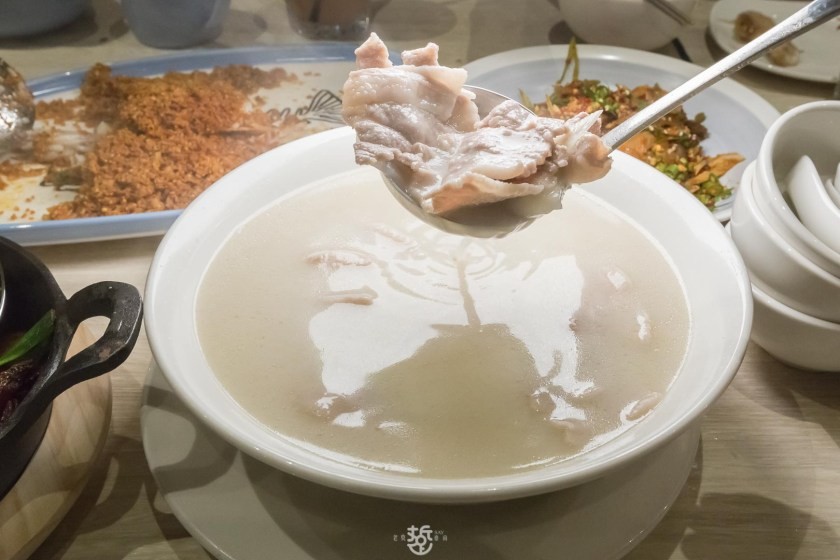 用豬大骨熬了8小時的乳白色豬大骨湯,與日式豚骨高湯很像。豬五花與蘿蔔片很搭,大滾起鍋前滴上花椒油提味,很甘甜。