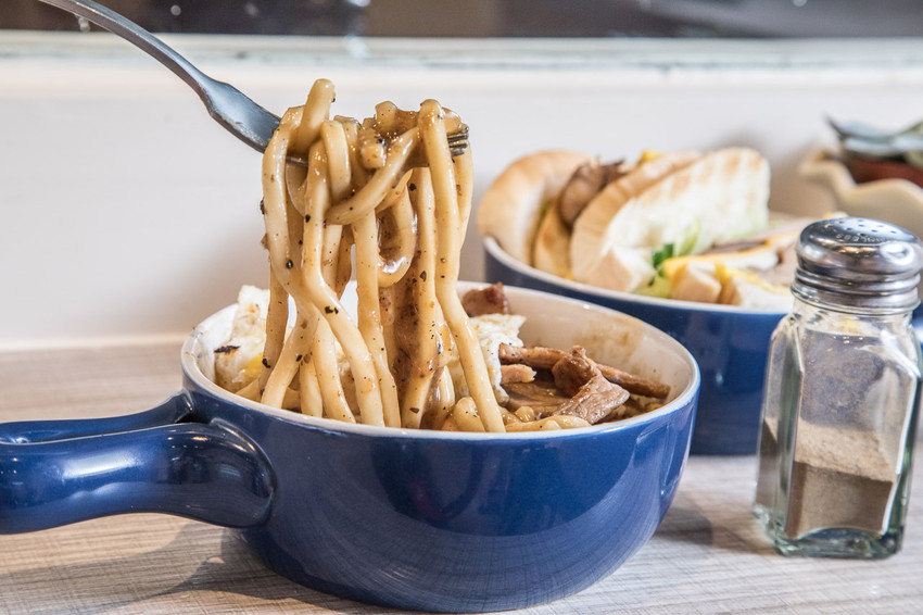 喬妹碳烤吐司舖-桃園民生店地的鐵板麵是用烏龍麵,口感Q彈紮實,比起一般軟爛的油麵,咬咬超愛鐵板烏龍麵,超好吃!黑胡椒醬也是喬妹自製的,黑胡椒的香氣相當明顯,微微的辣度頗為開胃呢