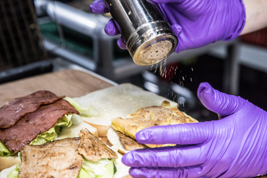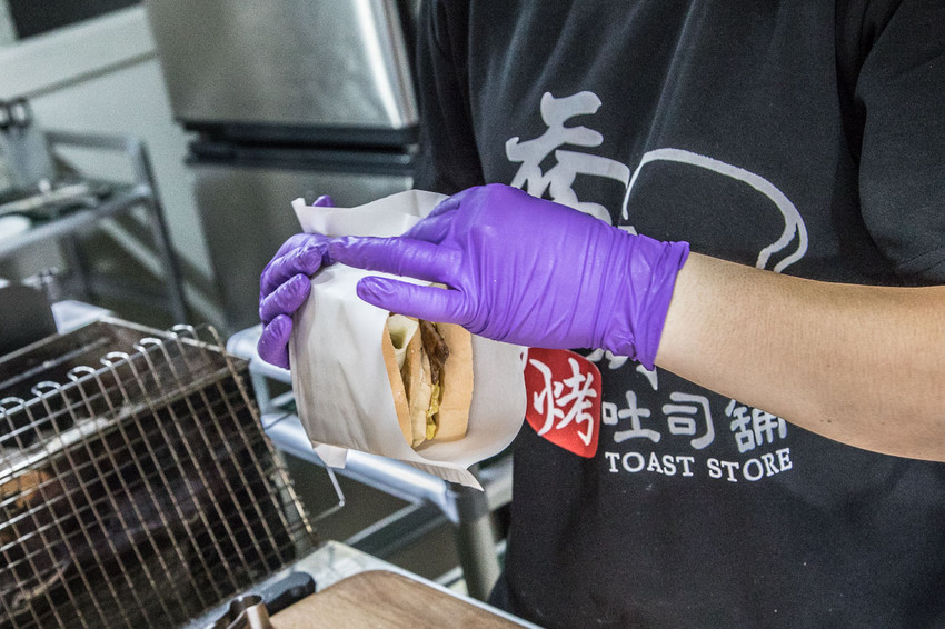 做好的三明治再用特製的防油紙袋裝起來,方便食用也不沾手