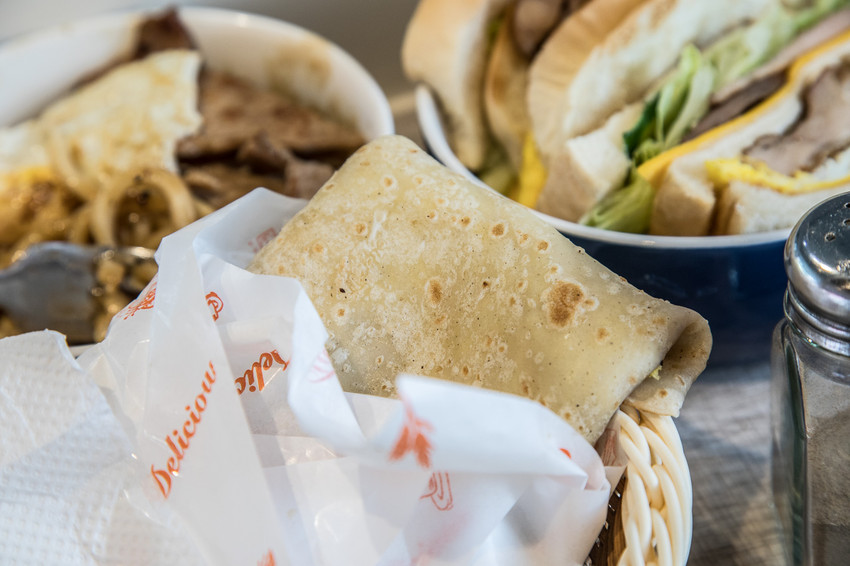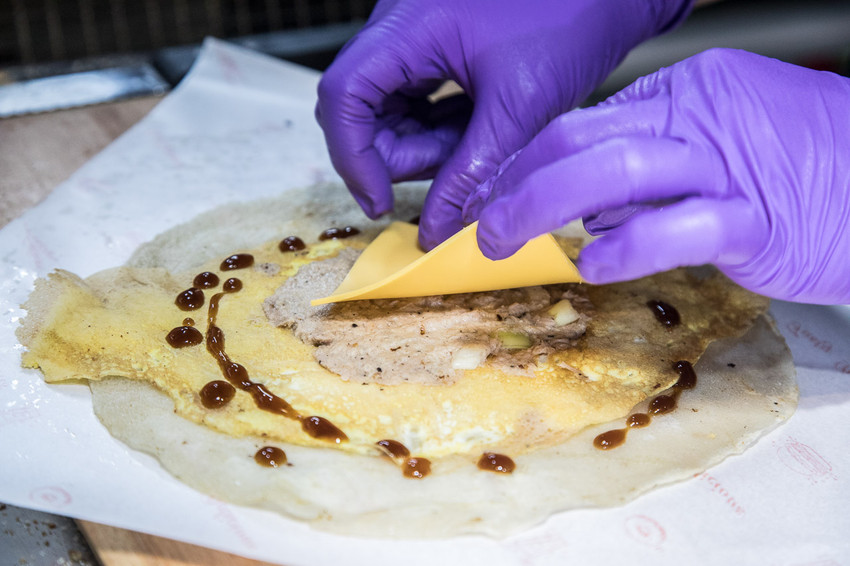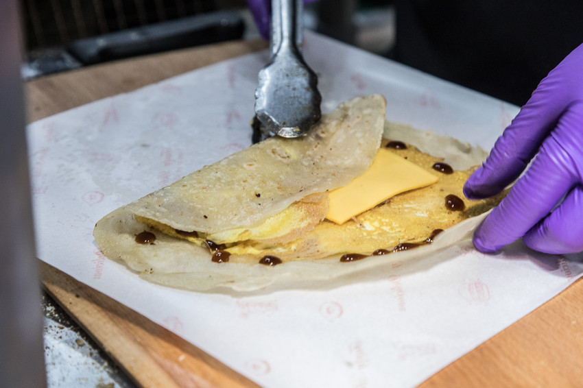 喬妹碳烤吐司舖-桃園民生店的蛋餅做法也跟一般的早餐店很不一樣,有點像是泰國香蕉煎餅的作法,將餡料放在中間,再對折成正方形的樣子