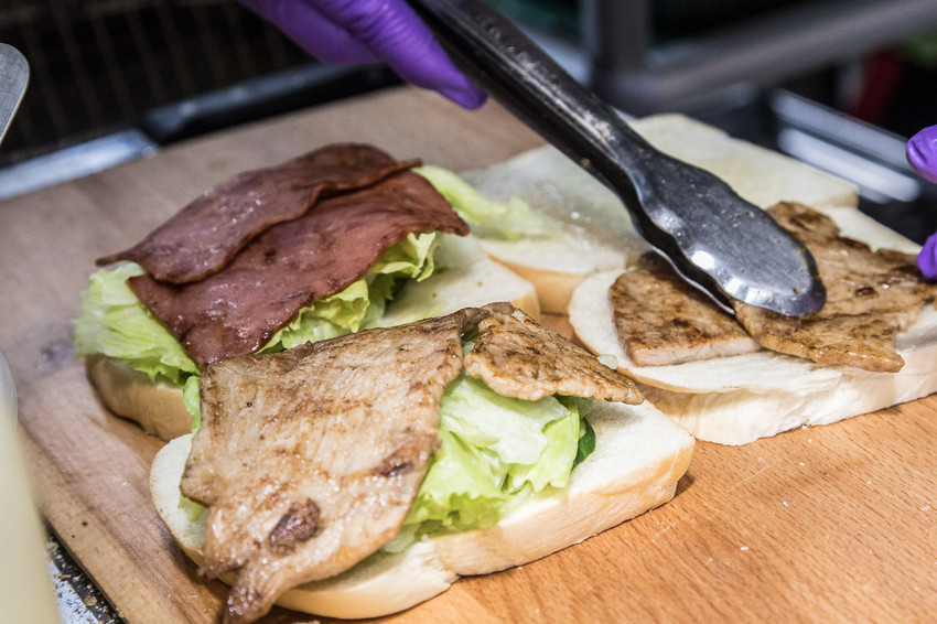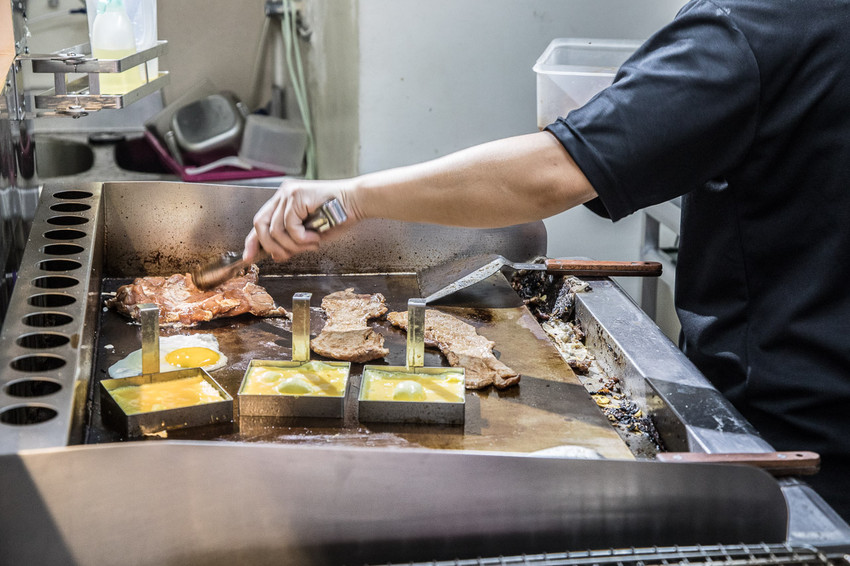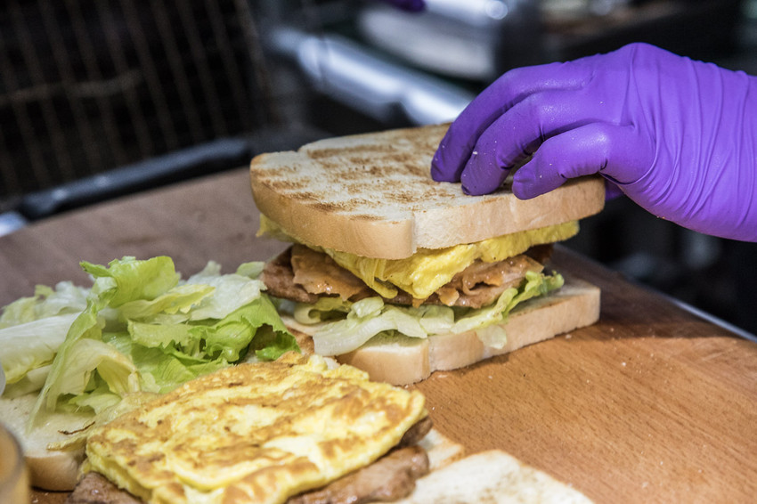 烤好的吐司在疊上豐盛的配料,喬妹碳烤吐司舖-桃園民生店的肉類都是自己醃漬,食材挑選也十分嚴格,為了符合吐司的形狀,連煎蛋都用特製正方形的模具來煎,力求每一口的口感都能一致!