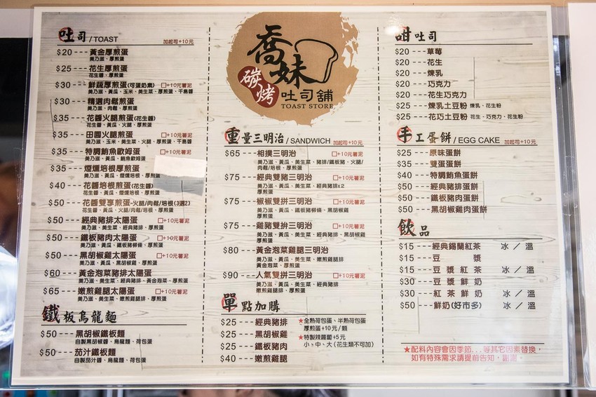 喬妹碳烤吐司舖-桃園民生店的菜單,雖然使用成本較高的炭火來製作,但整體價位還是相當平實,除了吐司、三明治外,還有多樣蛋餅及鐵板烏龍麵可以選擇,飲料最便宜的也只要15元,太佛心了!