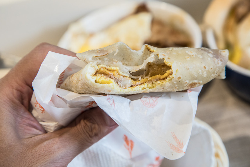 餡料都集中在中間,一口咬下每一口都可以吃到餡料,蛋餅皮吃起來很有彈性,中間的鮪魚餡也是自製的,綿滑香濃,不會像外面的鮪魚醬吃起來那麼油膩,蛋香也十分突出,好吃!