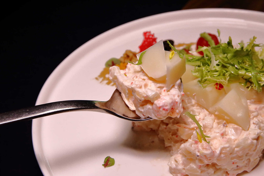 鮮脆清甜的綠竹筍切丁,與龍蝦沙拉醬拌攪後,再以飛魚卵點綴