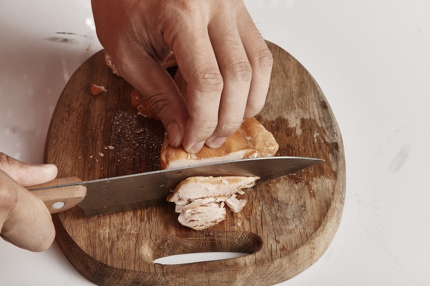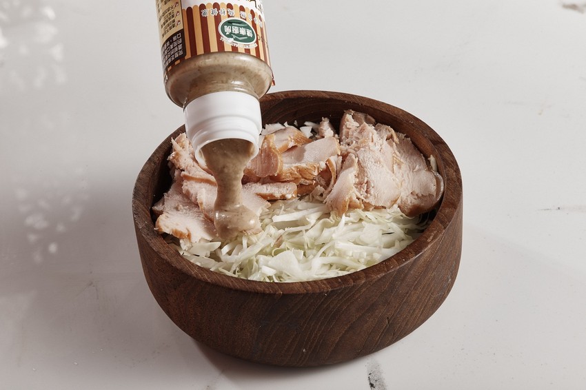 2.打開雞胸肉即時包,我先用「胡桃木燻雞」試做,就是燻雞的那種香味,光聞就很讓人期待。如果剛從冰箱拿出來,可以稍微微波一下,讓雞絲回復常溫。由於即食包本身就是熟的,打開就可以吃。先稍微切絲方便料理。
