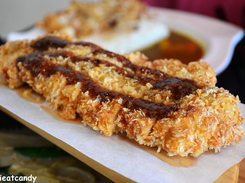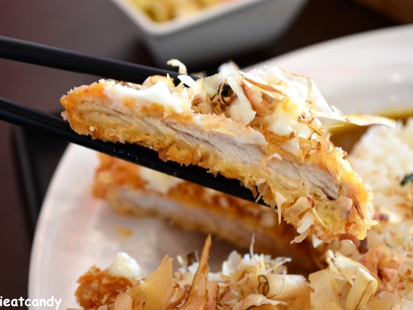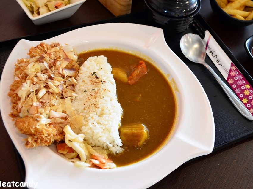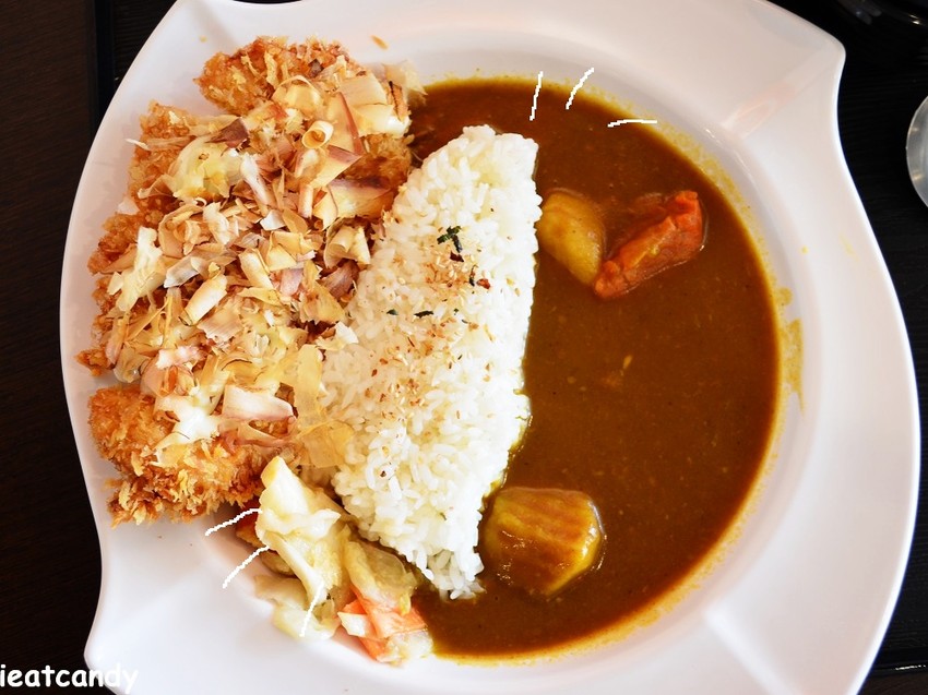先送上爸爸的松阪燒咖哩豬排飯,有看到亮點嗎? 白飯塑造一個台灣的樣子,好用心~豬排很有厚度,光看剖面就知道,上面撒上柴魚片及美乃滋,厚實度讓人吃完豬排就有一半飽足感了…咖哩內利用洋蔥、紅蘿蔔、馬鈴薯、鳳梨、香蕉、蘋果等熬煮而成,口味上會偏甜,入口盡是蔬果甜味,咖哩反而成為了配角了~(笑)