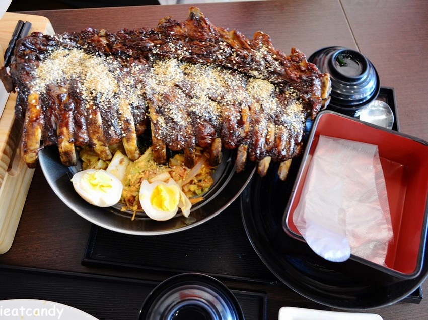 接著,就是超驚人的龍爪肋排丼,上面撒上大量磨製過的芝麻散發香氣,以適度火候將刷上特製醬汁的肋排均勻上色。老闆貼心地附上了手套方便我們直接扒開食用,吃起來肉質不柴,某些地方帶點Q度,有嚼勁但不會嚼不爛,一咬幾乎就骨肉分離。