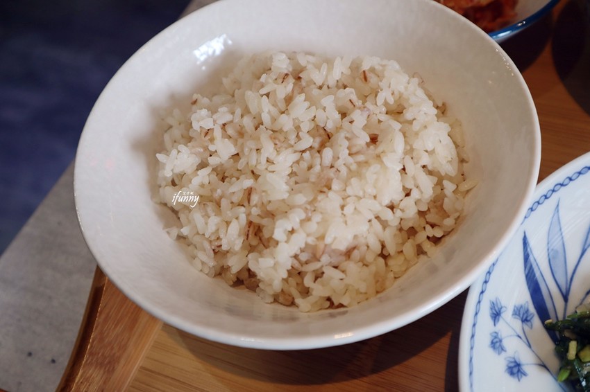 定食皆附了一碗麥飯,就是在飯中加入了大麥一起煮,飯裡頭見到一條條顏色較深的,就是大麥本人喔!據知大麥含有豐富的β-葡聚醣可溶性纖維,有助於降低膽固醇、維持血糖穩定、促進腸道蠕動等優點。麥飯吃來很Q,蠻好吃的,平常不太吃白飯的艾方妮,把這碗飯全部吃完。