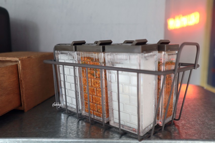 在自助飲水容器的層架上備有鹽、七味粉可供自行調味。 這天覺得餐點的調味其實已很足夠,可以不需再加調味料了!
