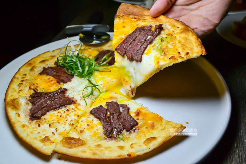 薄脆披薩搭配上溫泉蛋濕潤的口感,軟嫩香濃的起司和最近很熱門的溫體牛肉,薄脆的餅皮熱量比較少,適合女生或者是只想吃味道的同學