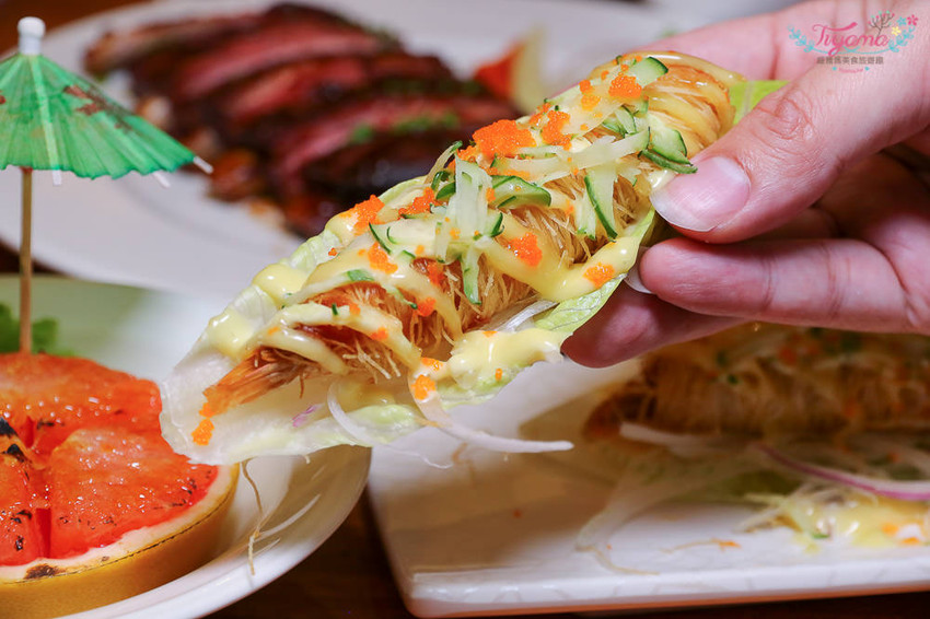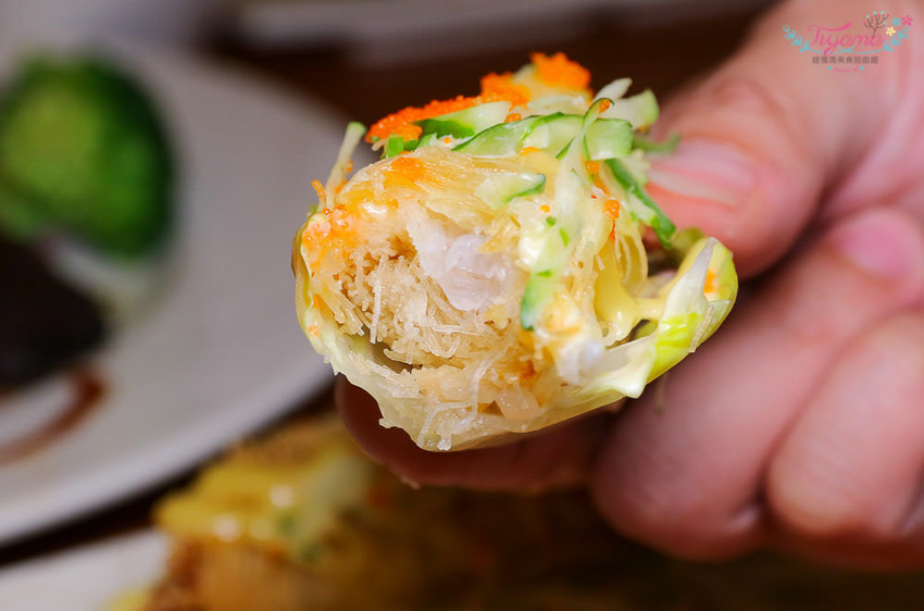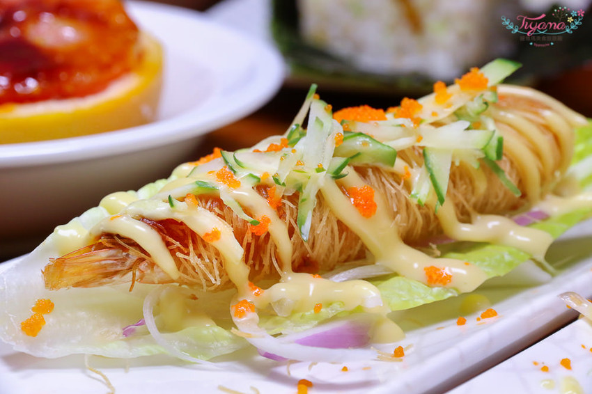 金絲蝦卷、蜂蜜芥末醬、小黃瓜絲、魚卵、蘿蔓生菜,「蘿蔓生菜金絲蝦卷」口感豐富,多層次的鮮甜滋味…讓人一口接一口,很容易一次秒殺吃光!!