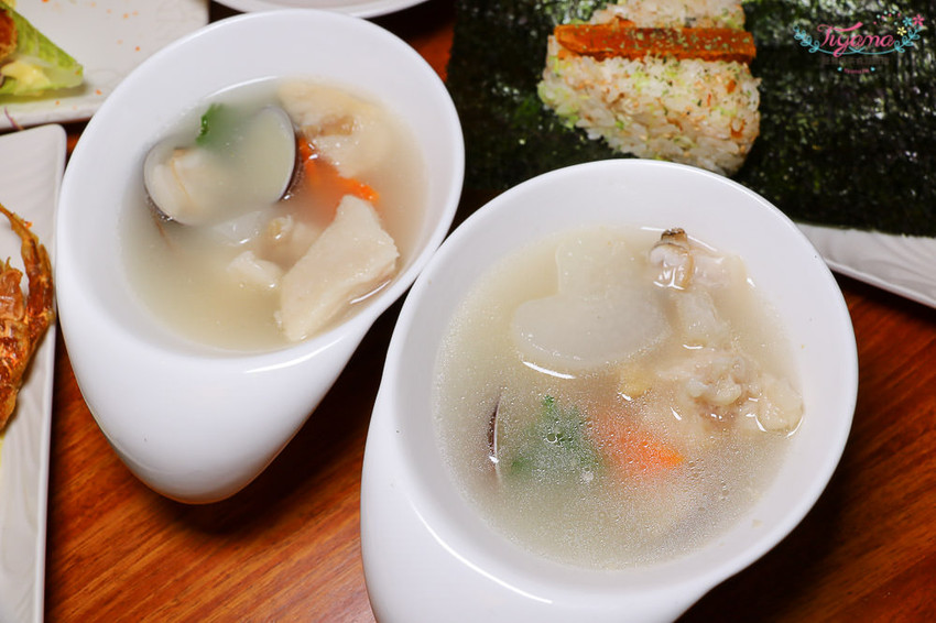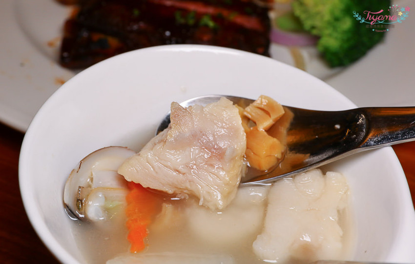 「極鮮虎掌干貝盅」虎掌用的是豬蹄筋,加入干貝、蛤蜊、紅白蘿蔔、少許香菜,湯頭濃郁高雅,暖胃又暖心…