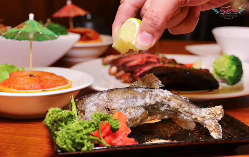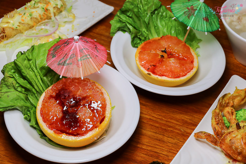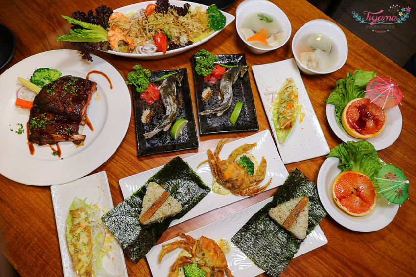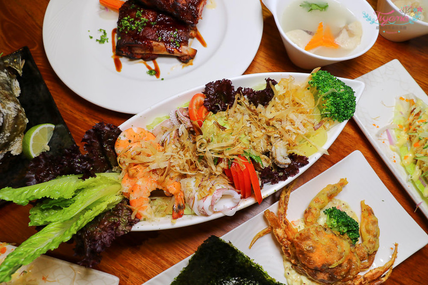 和風海鮮沙拉、軟殼蟹烏魚子飯糰、蘿蔓生菜金絲蝦卷、鹽烤子持香魚、蜜汁炭烤豬肋排、極鮮虎掌干貝盅、焦糖葡萄柚、50元飲料任選