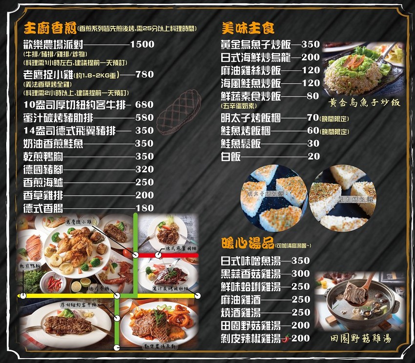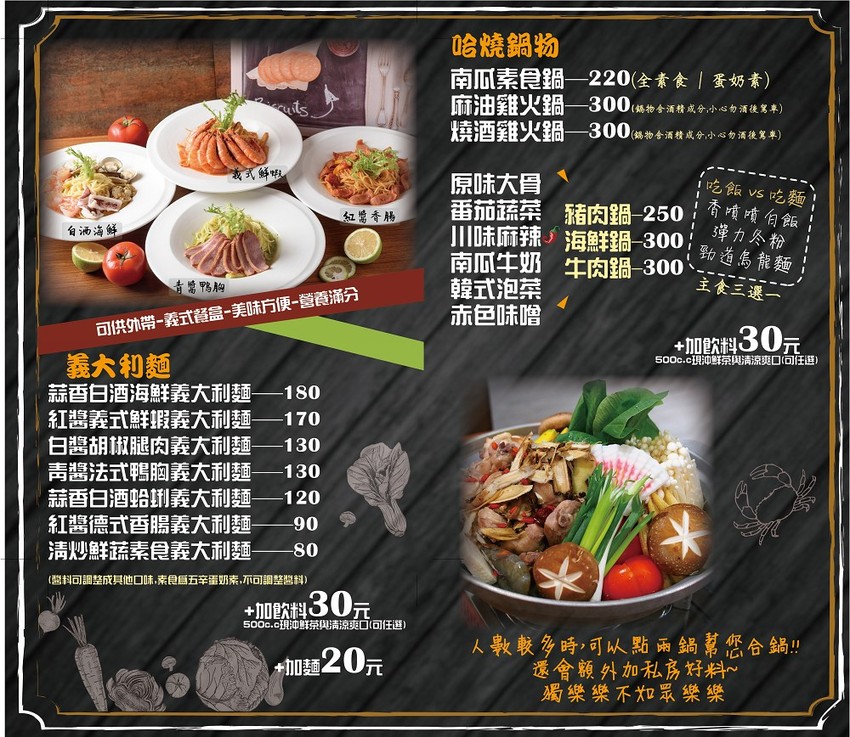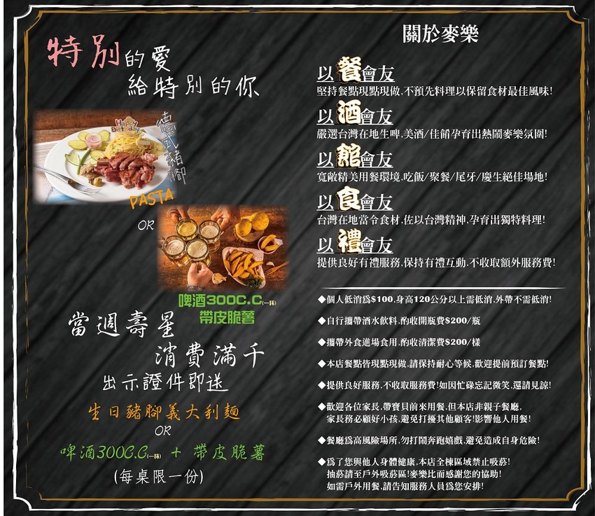 最新完整菜單,最重要別錯過壽星消費贈的超大方「生日豬腳義大利麵」,喜歡小酌就可選「啤酒300cc+帶皮脆薯」