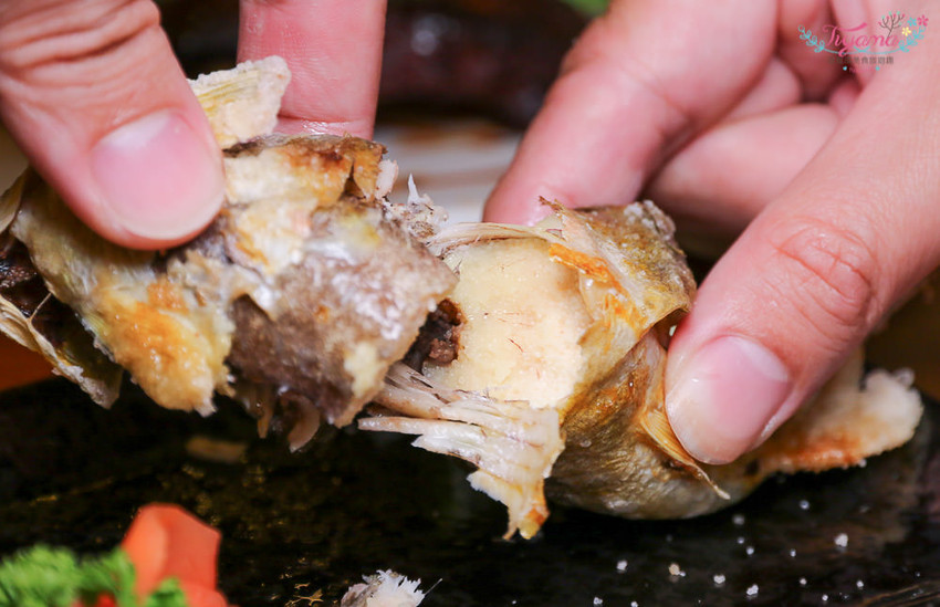 擠上檸檬汁增加鮮甜味,香魚本身就有很多小魚刺,加上迫不及待想吃香魚卵,顧不得形象,直接動手吃,魚肉肉質細緻、香魚卵濃郁鮮香,在嘴裡散開…吃到意猶未盡啊!!