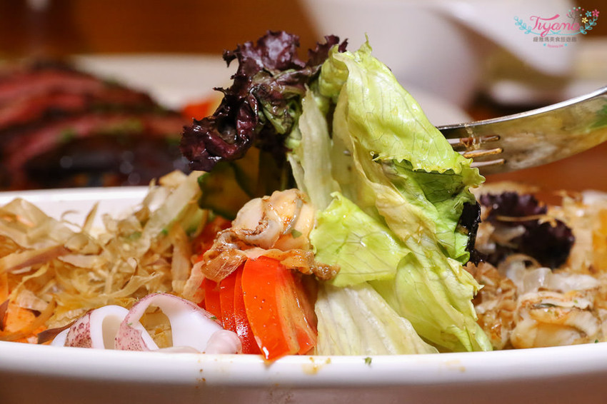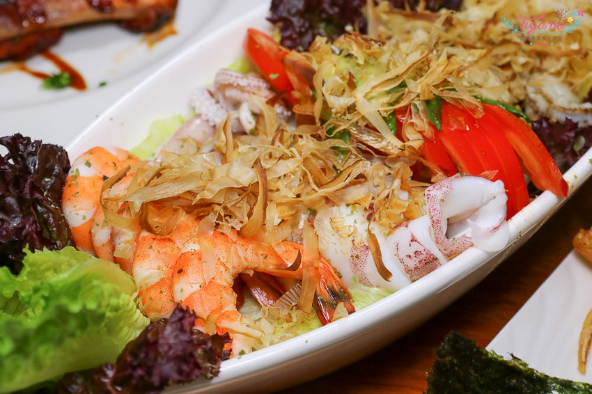 大份量「和風海鮮沙拉/2人份量」多種生菜搭配白蝦、小卷、帆立貝肉,撒上柴魚片增添風味,主廚特調和風醬有自然柑橘酸再帶點似有若無的微辣感,格外爽口開胃!!