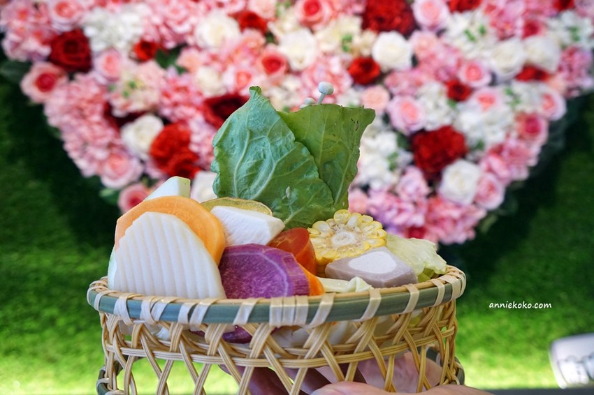 覺醒幸福.鍋物的菜盤好美喔,五彩繽紛的蔬菜用竹籃子盛裝,質感加倍,搭配花牆拍更為出色。