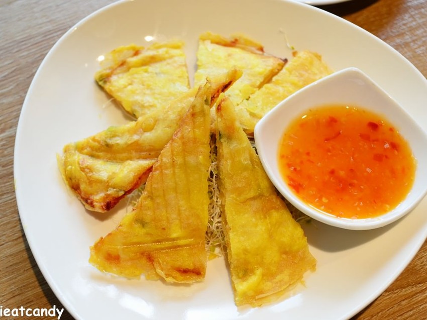 這道是泡菜海鮮煎餅,不會太厚,所以很容易解決~(不然吃完這道,我想就非常有飽足感了吧!) 不太會辣,小肥肉也吃得很開心,單吃比較沒味道,建議沾取一旁的泰式醬。