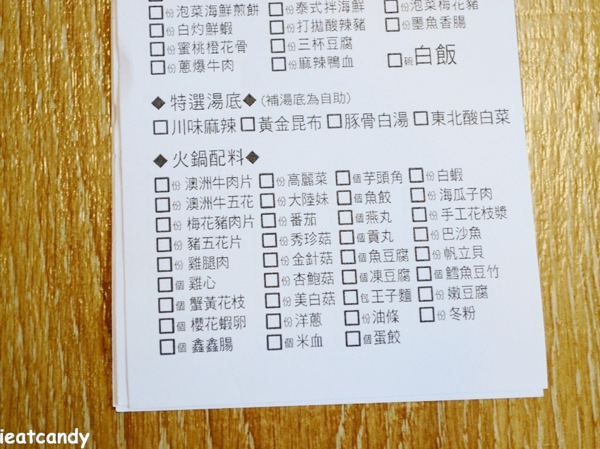丹青精緻火鍋+現炒料理吃到飽菜單: 價格來說在台中算便宜,而且能吃到五十道左右的熱食料理,可惜沒有帶我老公來,我老公很喜歡呢!這是桌上的點菜單,寫完交給店員即可。