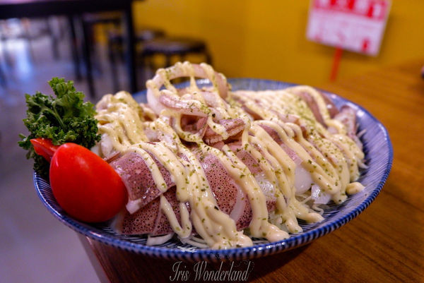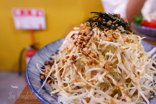 底下鋪滿了高麗菜絲,上頭淋上的是滿滿的日式美乃滋,美乃滋的量非常多,鹹甜中再帶上一點點酸感