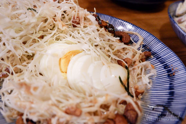 第一道沙拉就深得我們的心!高麗菜絲淋上日本胡麻醬,再撒上堅果和海苔絲