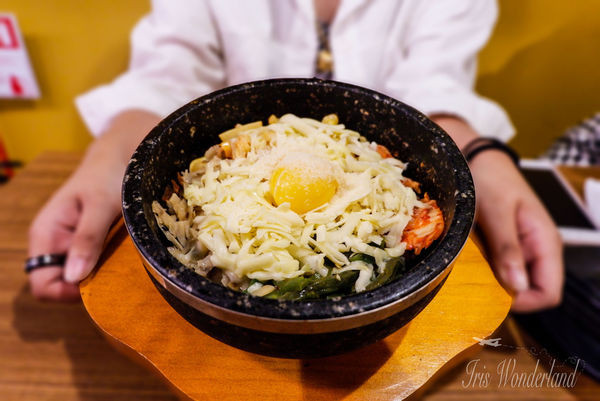 比較偏台式的石鍋拌飯,加入了泡菜、海帶、玉米等,鋪上滿滿的起司和一顆蛋黃