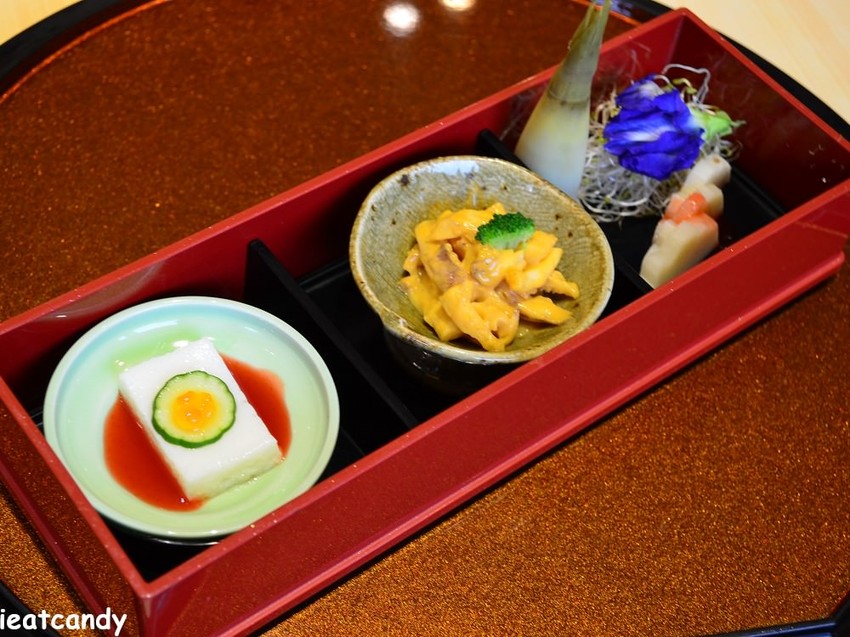 開胃小品: 依序從左至右: 山藥豆腐→海膽花枝→竹筍沙拉。