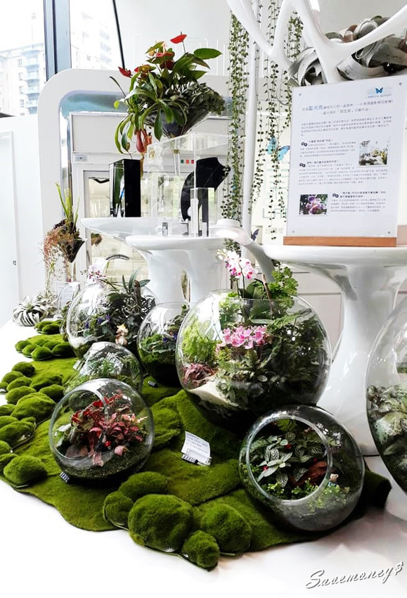 運用各種玻璃器皿裡面盛裝的植栽來妝點出一方綠意